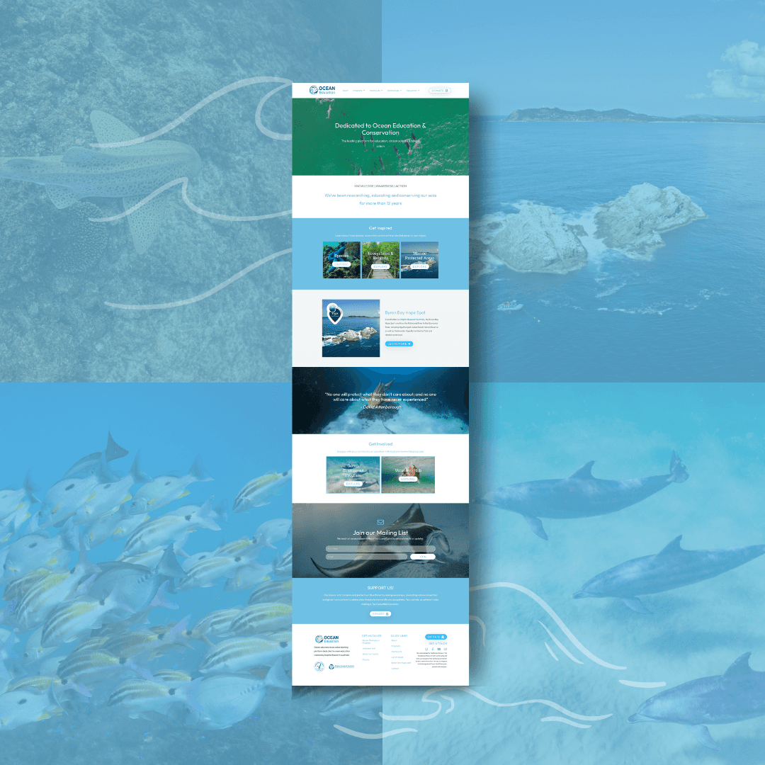 In an era where ocean health is more critical than ever, Ocean Education & Conservation serves as a dynamic online hub for marine education, conservation, and community engagement. The redesigned website was crafted to inspire action - offering clear, accessible pathways for users to learn, volunteer, and support ocean conservation initiatives across Australia. As both an educational resource and a volunteer portal, the platform empowers students, educators, and ocean advocates alike to get involved and make a measurable impact on our marine ecosystems.